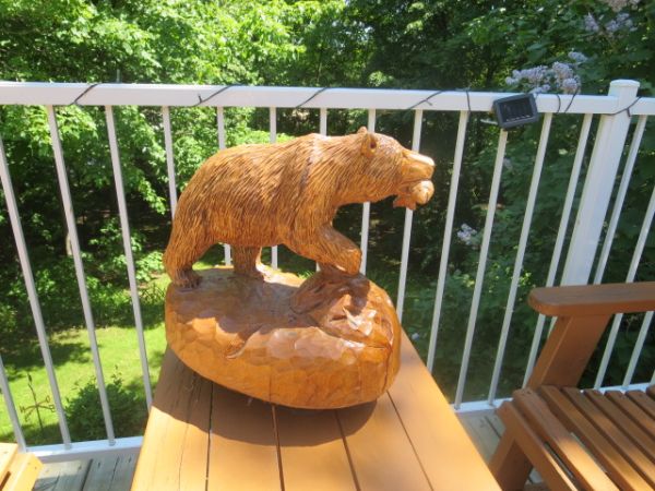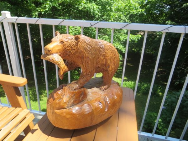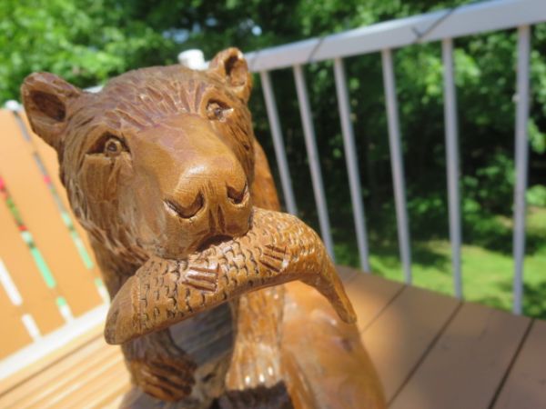 Ours sculpté en bois de tilleul avec saumon dans la gueule .
