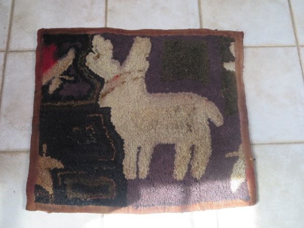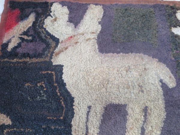 Tapis crocheté représentant un chevreuil ou un lapin, riche en textures et en couleurs.