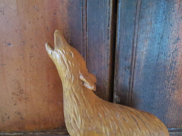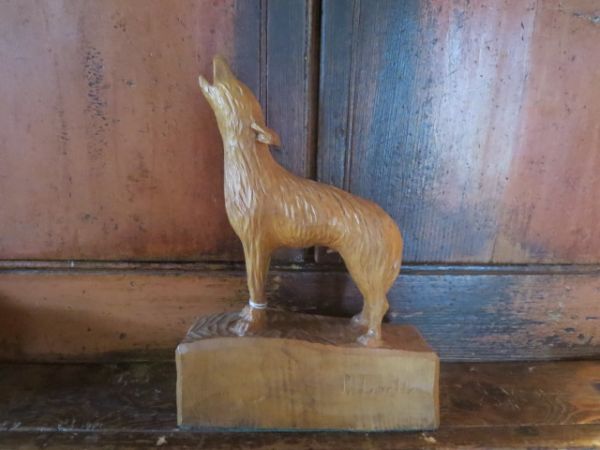 Loup en bois de tilleul, sculpté par Pierre Labelle.